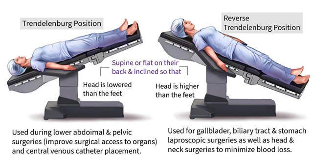 - Kirurgi: I kirurgiske sammenhænge bruges Trendelenburg-positionen ofte for at forbedre adgangen til specifikke områder af kroppen, især den nedre del af maven og bækkenet. Denne position får de abdominale organer til at flytte sig opad og skaber mere plads til, at kirurger kan arbejde. Den anvendes ofte under laparoskopiske operationer, gynækologiske operationer og kolorektale indgreb. Kirurger bruger også positionen til at få bedre udsyn og adgang til de ønskede organer ved at forskyde strukturer som tarmene og bugvæggen.